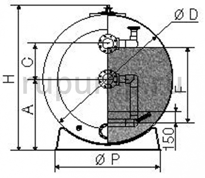 Вентиль входит в комплект фильтра и размещается в боковой части. Дополнительно следует приобрести выгрузной люк для отработанного песка, манометр и наполнитель. Фильтр оснащён смотровым окном, через которое можно оценить масштабы загрязнения и увидеть объем извлеченной из воды грязи. Фильтр также укомплектован коллекторов соплового типа. Более тщательное распределение воды в отсеке фильтрации достигается благодаря имеющемуся зазору между главным диффузором и поверхностью песка.